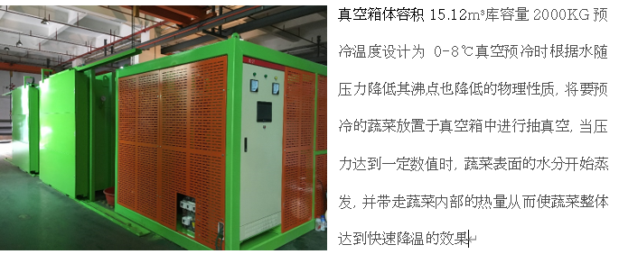 4卡板果蔬真空預(yù)冷機主要針對小型農(nóng)場的預(yù)冷加工使用;真空箱容積15.12m3,庫容量2000kg,預(yù)冷溫度設(shè)計為0~8℃;